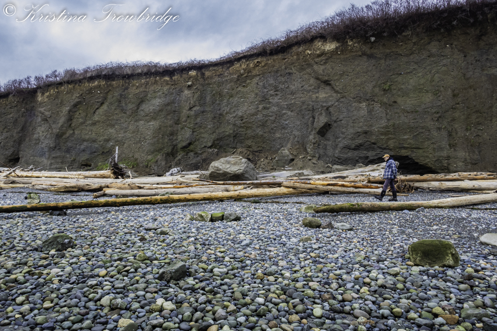 Tom walks across the rocks on the beach