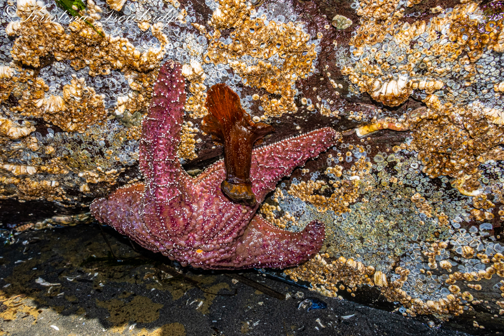 Pink Sea Star and barnacles under a rock