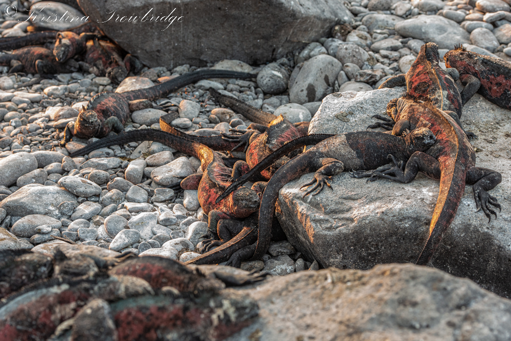 Marine iguanas in sunset glow