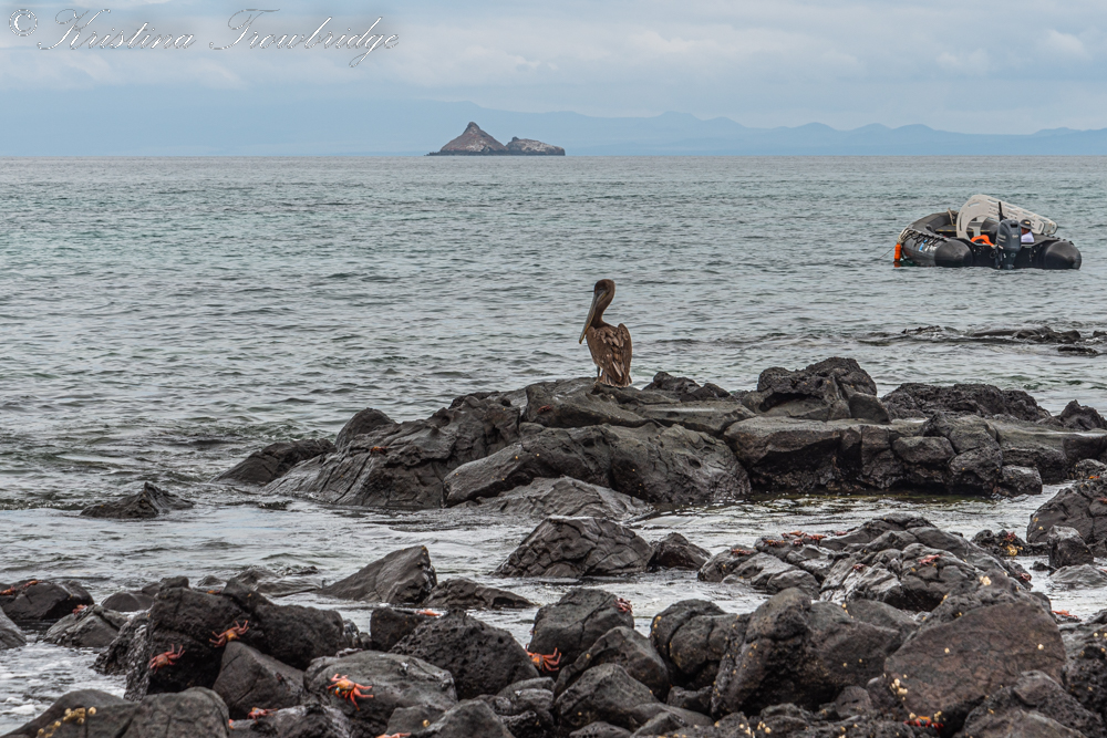 Brown pelican and Sally Lightfoot on the beach